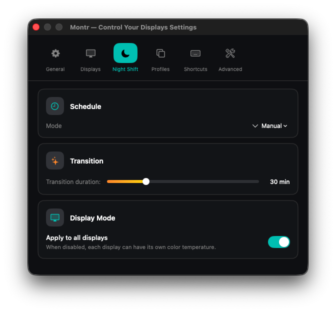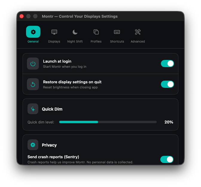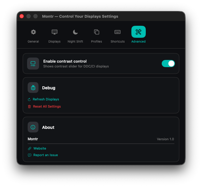 Note: DDC/CI hardware brightness control works with most external monitors. For displays that don't support DDC/CI, Montr provides a software brightness fallback (clearly labeled in the UI).