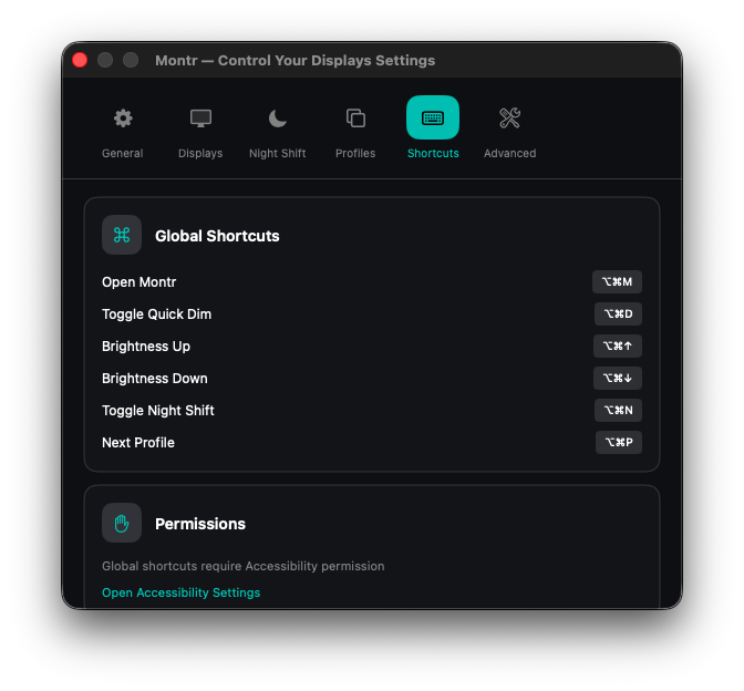 Global hotkeys for common actions. Adjust brightness, toggle Night Shift, or switch profiles without looking.