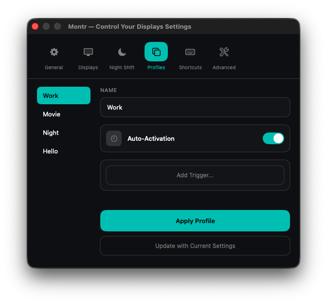 Global hotkeys for common actions. Adjust brightness, toggle Night Shift, or switch profiles without looking.