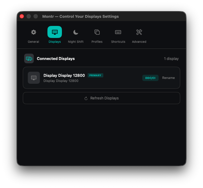 Note: DDC/CI hardware brightness control works with most external monitors. For displays that don't support DDC/CI, Montr provides a software brightness fallback (clearly labeled in the UI).